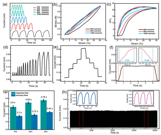 The sensing performance of entangled sensors. (a) The sensor outputs under different strain-applied speeds. The (b) stress and (c) relative current changes during the loading−unloading cycle with different strain-applying speeds. The current response of the sensor under (d) fast and (e) sustained strain. (f,g) The response time and recovery time of the strain sensors at strains of 10%, 20%, and 30%. (h) The cyclic stability of the sensors.