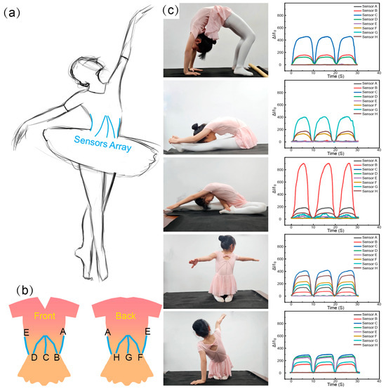 The application of the entangled sensor. (a) Illustration of utilizing sensor arrays to monitor the movements of the dancer. (b) The layout of strain sensors in the dance monitoring garment. (c) The various dance movements and respective current response of the sensor array.