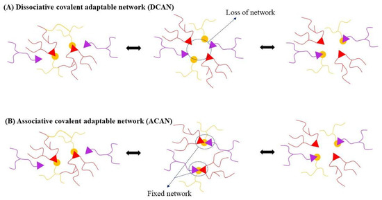 (A) Dissociative exchange covalent adaptable networks CANs, and (B) Associative exchange CANs include “vitrimers”—contain dynamic bonds that can break and form concurrently, maintaining fixed cross-linked density.
