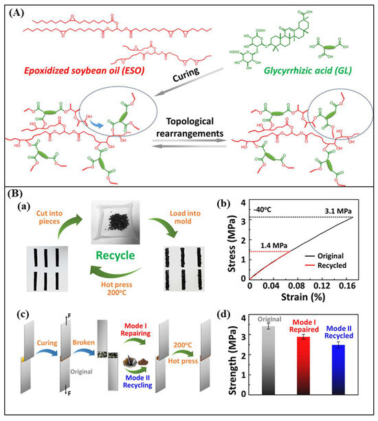 (A) Synthesis of ESO–GL–based vitrimer, and (B) recycling process of ESO–GL–based vitrimer. (a) Photos showing the recycling process of ESO–GL vitrimers, (b) stress-strain curves of ESO–GL vitrimers at – 40 °C before and after recycling, (c) Schematic view of lap-shear tests for ESO–GL vitrimers, and (d) Lap-shear strength of original, repaired, and recycled vitrimers. Adapted with permission from [39].