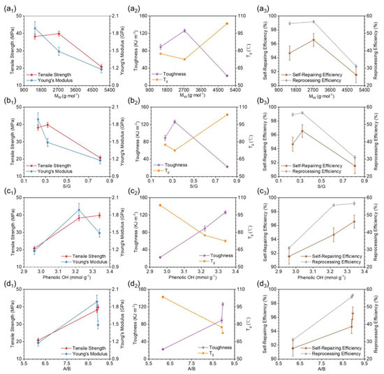 The focus of this study was the effect of lignin structure on the performance of the resultant lignin-based epoxy vitrimers (LEVs). The experimental results from the study showed that the properties of resultant LEVs, such as tensile strength, toughness, self-repair ability, and reprocess ability, have a strong correlation with the phenolic hydroxyl content and flexible to rigid linkages ratio in lignin. Meanwhile, strong correlations have also been noticed between the molecular weight of lignin with the thermal properties of the resultant materials. Figure 8 shows the correlation between the performance of LEVs and fractionated lignin structure. As shown in Figure 8a, with increasing Mw of the lignin fractions, the Young’s modulus and tensile strength of LEVs showed a significant decreasing trend, while Tg showed the opposite variation tendency. At the same time, the self-repairing and reprocessing efficiencies were less favourable for LEVs with higher molecular weights. The effects of the S/G ratio of fractionated lignin on the properties of LEVs are shown in Figure 8b. Interestingly, the ratio of S/G showed the same effects on the LEV performance as molecular weight, suggesting that the increase in the molecular weights and S/G ratio are detrimental to transesterification.