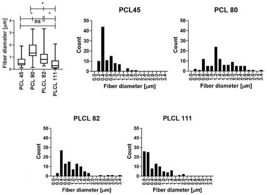 Graphs (boxplots) of the fiber diameters of the electrospun samples with histograms showing the fiber diameters. The statistical analysis was performed using the Friedman test: n = 100; p < 0.05 (ns); 0.001 (*).