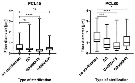 Graphs of the fiber diameters for the non-sterilized electrospun samples and the samples sterilized with ethylene oxide and gamma irradiation at 15 and 40 kGy. The statistical analysis was performed using the Friedman test: n = 100; p < 0.1234 (ns); 0.0332 (*); 0.0002 (***); 0.0001 (****).