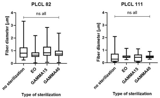 This study describes the impacts of these sterilization methods on nanofibrous materials made from biodegradable polyesters, particularly with regard to changes in their morphology, degradation behavior, and hemocompatibility. Although the basic impacts of various sterilization methods on electrospun PCL nanofibers with a molecular weight of 45 kDa have already been reported [], the impacts of two differing doses of gamma irradiation have not yet been tested. Moreover, in contrast to previous comparable studies, our study considered a set of polymers including PCL with a molecular weight of 80 kDa and PLCL copolymer materials rather than just PCL of 45 kDa. The study also included the selection of suitable solvent systems with regard to the degradation of PLCL; whereas the spinning of PLCL from an organic acid solution results in changes in the morphology of the material, this approach has the potential to influence the degradation behavior of the resulting materials [].