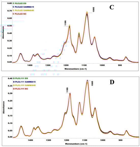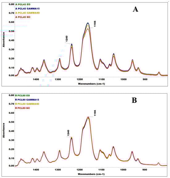 Ionizing radiation has the potential to initiate a complex C-C, C-H, and C-O bond cleavage mechanism in polymers, which often results in the formation of radicals, the instability of which may subsequently lead to polymer crosslinking or to the shortening of the length of the polymer chain. If the polymer is exposed to ionizing radiation in the presence of oxygen [] or to ethylene oxide, it may succumb to oxidation. PCL and PLCL polymers contain C-H bonds in their chemical structures from aliphatic chains (stretching vibrations of the C-H bonds in the 2960–2780 cm−1 region) that can be cleaved and oxidized to form C=O, O-C, and C-O-C bonds. These bonds are present in both PCL and PLCL [], [,,], which renders it very difficult to identify changes. All the spectra shown (Figure S2) were subsequently compared to the band intensity of the stretching vibration of the C=O carbonyl group (1722 and 1750 cm−1) [,,]. No broadening of the C=O band was evident in the sterilized material spectra, nor were any significant changes determined in the ratio of its intensity with the C-H bands (2945, 2865, and 2870 cm−1) [,], which appears to indicate the significant oxidation of the material. However, concerning the spectra of the PCL45 and PLCL82 materials exposed to gamma irradiation, a change was evident in the relative ratios of the intensities of the C=O and C-H bands to the C-O-C bands (1240, 1166, 1186, and 1085 cm−1) [,] and the bands in their vicinities (Figure 4). Such intensity ratio changes in this region of primarily deformation, skeletal, and stretching vibrational bonds could potentially indicate structural changes in the irradiated material. Similar differences, but at much lower intensities, were determined in the spectra of the PCL80 and PLCL111 irradiated materials.
