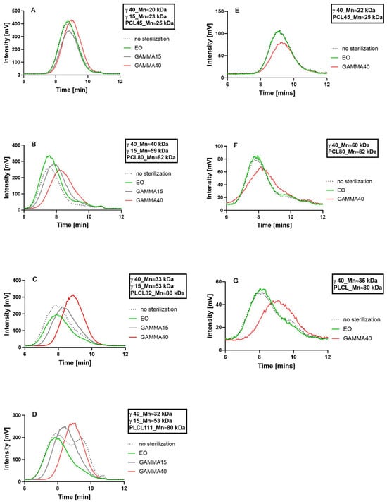 Graphs for the comparison of the GPC chromatograms of the electrospun materials and granulates from the biodegradable polyesters without sterilization and following ethylene oxide sterilization and gamma irradiation sterilization at two different doses (15 and 40 kGy): PCL45 nanofibers (A); PCL80 nanofibers (B); PLCL82 nanofibers (C); and PLCL111 nanofibers (D); PCL45 granulate (E); PCL80 granulate (F); and PLCL granulate (G). The data in the boxes indicate the molecular weight values calculated according to the respective standards (PS) (note: the manufacturer states Mn 45,000 for PCL45; however, the GPC method applied measured 25 kDa).