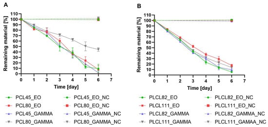 The weights of the samples of the materials were monitored over 6 days of degradation, and the weight losses were calculated using Equation (1). Due to the differing enzyme affinities of the polymer substrates, the degradation process for the PCL45 and PCL80 materials involved the use of lipase, and the degradation of the PLCL82 and PLCL111 was ensured by Proteinase K. The results of the mass loss during degradation analysis (Figure 6) indicated similar degradation trends; however, a number of differences were noted between the samples. A significant difference was observed between the PCL80 gamma and the other samples from the third day of degradation to the end of the experiment. The slowdown in the degradation process was most likely due to the higher molecular weight of the polycaprolactone in the PCL80 than in the PCL45. In addition, gamma irradiation may have influenced the creation of new chemical bonds between the polymeric chains, which may have led to the crosslinking of the polymer network in the fibers at the same time as the observed cleavage of the polymer chains [] (Figure 6A). The weight losses of the PLCL samples as a function of time are shown in Figure 6B; the mass analysis of the samples of this material revealed very similar degradation profiles over time. However, it can be observed that, concerning the first half of the degradation experiment, the slowest degradation process was evinced by the PLCL111 ethylene oxide sample.