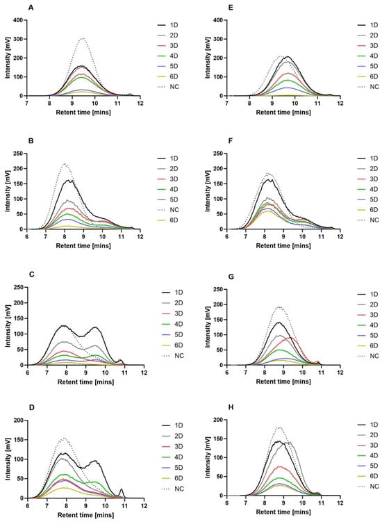Graphs for the comparison of the GPC chromatograms of the electrospun biodegradable polyester materials subjected to ethylene oxide and gamma irradiation (dose of 40 kGy) sterilization during the degradation process. The number with the letter D indicates the number of days of degradation, and NC denotes samples without the addition of enzymes. (A) PCL45_EO, (B) PCL80_EO, (C) PLCL82_EO, (D) PLCL11_EO, (E) PCL45_GAMMA, (F) PCL80_GAMMA, (G) PLCL82_GAMMA, and (H) PLCL111_GAMMA. For the purposes of comparison, the polymer concentration was converted to the actual mass loss of the material on the given day of degradation.