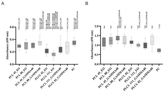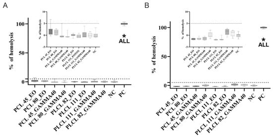 Graphs showing the percentage of hemolysis evaluated based on the measured absorbance of the hemoglobin released in the hemolysis test following the interaction of non-coagulable whole blood with the nanofibrous materials following sterilization with ethylene oxide (PCL45_EO, PCL80_EO, PLCL82_EO, and PLCL111_EO) and 40 kGy gamma irradiation (PCL45_GAMMA40, PCL80_GAMMA40, PLCL82_GAMMA40, and PLCL111_GAMMA40) 3 months (A) and 1 year (B) after sterilization. Positive control (PC): distilled water; negative control (NC); PBS buffer. A p value of p ≤ 0.05 (*) was considered statistically significant.
