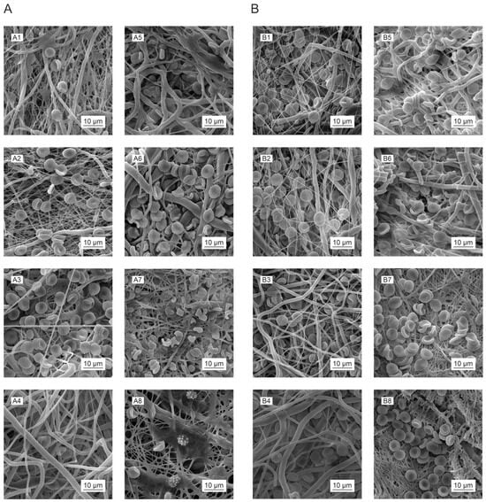 SEM images of the tested materials after incubation with whole blood (the nanofibrous materials following sterilization with ethylene oxide were tested 3 months (A) and 1 year (B) following sterilization): PCL45_EO (1), PCL45_GAMMA40 (2), PCL80_EO (3), PCL80_GAMMA40 (4), PLCL82_EO (5), PLCL82_GAMMA40 (6), PLCL111_EO (7), and PLCL111_GAMMA40 (8); scale bars: 10 µm.