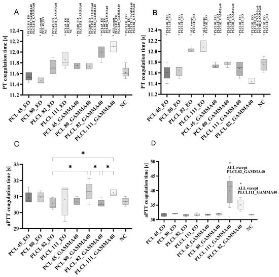 It is essential that an assessment be performed of any material destined for use in cardiovascular applications in terms of its hemocompatibility, i.e., its interaction with selected components of human blood. Hence, this study included the determination of the influence of the studied materials on the integrity of the erythrocyte membrane (hemolysis testing), as well as on platelet activation (thrombogenicity testing) and potential anticoagulant effects (coagulation testing). The testing methodology adopted in this study was based on the procedures described in one of our previous papers []. Hemolysis was tested by means of direct contact with fresh, noncoagulated whole blood (blood drawn into an anticoagulation solution); thrombogenicity was tested via direct contact with fresh native platelets (PRP, platelet-rich plasma); and coagulation was assessed via direct contact with clinical plasma (thawed clinical plasma). Aiming at determining the short-term and long-term impacts of the two types of sterilization on hemocompatibility, the materials were tested shortly after sterilization (up to 3 months) and 1 year following sterilization. The testing procedure included a comparison of the two sterilization methods for each material, and evaluated the influence of the polymer used, the molecular weight of the polymer, and the solvent system used in the production of the fibers.