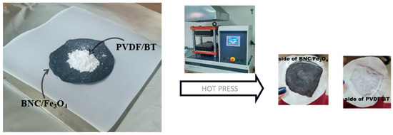 Commercial BaTiO3 underwent mechanical activation in a Retsch PM100 planetary mill using zirconium oxide jars and 5 mm diameter balls with 20:1 ball/powder mass ratio. The milling activation durations were 5, 10, and 20 min at a rotational speed of 400 RPM, resulting in the designation of powders as BT5, BT10, and BT20 based on milling time. The synthesis of the PVDF/BT layer involved a two-step process. Initially, 5 wt% mechanically activated BT was homogenized with PVDF in ethanol. After centrifugation and ethanol evaporation, the resulting powder mixtures were categorized as PVDF, PVDF/BT0, PVDF/BT5, PVDF/BT10, or PVDF/BT20. The fabrication of the multilayer composite comprising PVDF/BT and BNC/Fe3O4 films was achieved through hot pressing. Specifically, 1.5 g of the prepared PVDF-BT mixtures was uniformly applied to the dry BNC/Fe3O4 film. We kept the thickness of the films constant. The overall thickness of the layered composites were (0.22 ± 0.01) mm, while individual BNC/Fe3O4 layers were (0.9 ± 0.01) mm, and PVDF/BT layers had a thickness of (0.13 ± 0.01) mm [16]. Figure 1 provides a graphical depiction of the synthesis process for obtaining composite films.