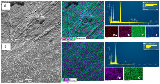 The compatibility of all layers in composite films is of paramount importance, as it directly affects the permeability of water vapor and other gases. In the previous research, detailed cross-sections of all samples were presented to gain insight into the achieved contact between layers [16]. To provide a comprehensive view and microscopic insight into the samples, the current study introduces SEM-EDS imaging of the surface appearance. Due to the relatively similar appearance of all synthesized composite films, the PVDF/BT0/BNC/Fe3O4 film is presented as being representative. The SEM-EDS images in Figure 2a,b show the surface morphologies of the composite film. Figure 2a illustrates the PVDF/BT side of the film, while, under Figure 2b, the BNC/Fe3O4 side of the film is shown.