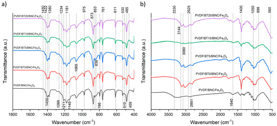 FTIR spectra of the samples. (a) Display of composite films from the PVDF/BT side and (b) the composite films from the BNC/Fe3O4 side.