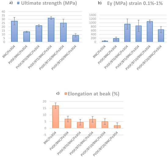The mean values of Young’s modulus of elasticity presented in Figure 4b indicate that the addition of the PVDF/BT layer increases Young’s modulus values. This leads to the establishment of the mechanism of mechanical reinforcement of the polymeric composite with filler particles [58,59]. The sample with the BT activated for 10 min has the highest modulus value of 1068 MPa; meanwhile, the sample with the BT activated for 20 min yielded a modulus value of 645 MPa, which is even lower than the PVDF/BT0/BNC/Fe3O4 sample. Additionally, from Figure 4b, we observe high values of standard deviations (significant variability in the results), particularly in the case of the PVDF/BT10/BNC/Fe3O4 sample and the BNC/Fe3O4 sample. The data exhibit wide dispersion around the mean values.