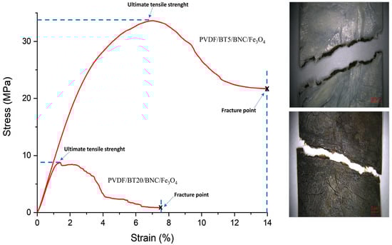 The graph in Figure 5 illustrates the correlation between stress and strain. Based on this diagram, another important mechanical property of materials, i.e., toughness, can be assessed. Toughness is the ability of a material to absorb energy up to fracture [61]. It is calculated by integration as the area under the stress–strain curve. The larger the area, the greater the material’s toughness. In Figure 5, a comparison of the films PVDF/BT5/BNC/Fe3O4 and PVDF/BT20/BNC/Fe3O4 is shown. The PVDF/BT5/BNC/Fe3O4 film is depicted as the film with the largest stress–strain curve and a toughness modulus (Mt) of 2611.41 KJ/m3, thus exhibiting the highest toughness. On the other hand, composite film PVDF/BT20/BNC/Fe3O4 (Mt 285.38 KJ/m3) absorbs the least energy before the fracture of the film itself, so its integrated area is the smallest.