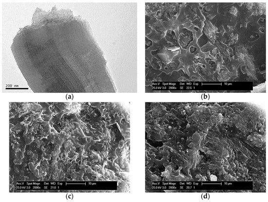 TEM micrographs of SBA-15 particles, dispersed in acetone and further deposited in a holder (a). SEM pictures at fracture surface for different composites: PHBSBA4 (b), PHBSBA8 (c), and PHBSBA16 (d).