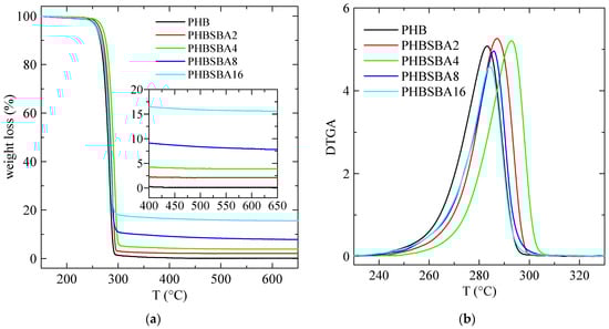 TGA (a) and DTGA (b) curves under nitrogen for PHB and its composites with SBA-15. The amplified inset in (a) reflects the content in SBA-15 of the composites.
