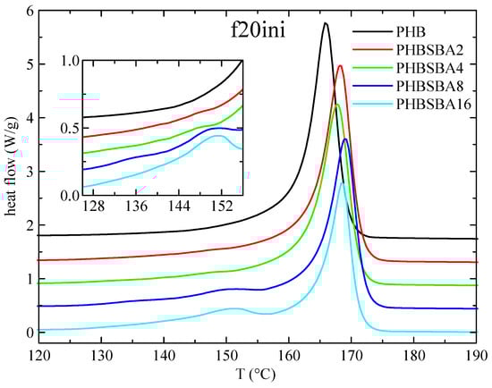 DSC experiments were used, first, to determine the different phase transitions. Thus, Figure 3 shows the DSC heating curves obtained in PHB and its composites with SBA-15 during the first melting at 20 °C/min. Two clear temperature intervals are observed: a main melting endotherm, at around 166 °C for the neat PHB with slightly higher values for the composites, and a second interval at lower temperatures (between around 130 and 155 °C). No features are observed for neat PHB in this inferior interval, but one or two small melting endotherms are observed in the composites, involving an enthalpy that increases with the SBA-15 content, as observed in the amplified inset.