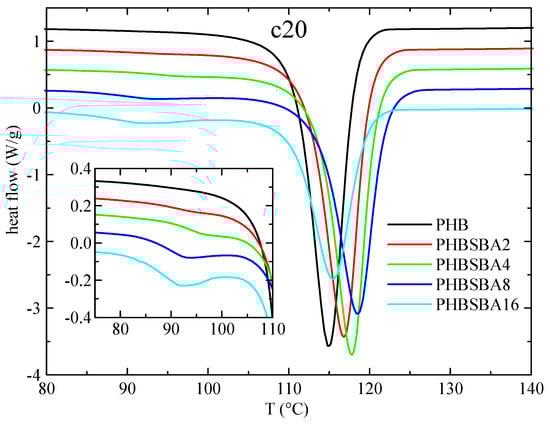 Figure 4 shows the DSC curves for PHB and its composites in the subsequent cooling from the melt (at 20 °C/min). It is important to emphasize at this point that the PHB samples do not crystallize on cooling from the melt at regular DSC rates in most of the published works, most probably because the molecular weight is too high, and only in a few cases [,] that crystallization is readily observed, as it happens with the present PHB matrix. Thus, the main crystallization exotherm can be seen in neat PHB with a peak crystallization temperature, Tc, of around 115 °C, and for the composites (similarly to the behavior of TmaxDTGA) there is an initial increase on passing from PHB to PHBSBA2, PHBSBA4 and PHBSBA8, decreasing then for PHBSBA16. But in all cases Tc of the composites is higher than the one for PHB, indicating a certain nucleating effect of the mesoporous silica. At lower temperatures, and similarly to the first melting, there is a region with small exotherms, whose enthalpy increases as the SBA-15 content increases. But now it appears to be a single component in these exotherms, as observed in the amplified inset of Figure 4.