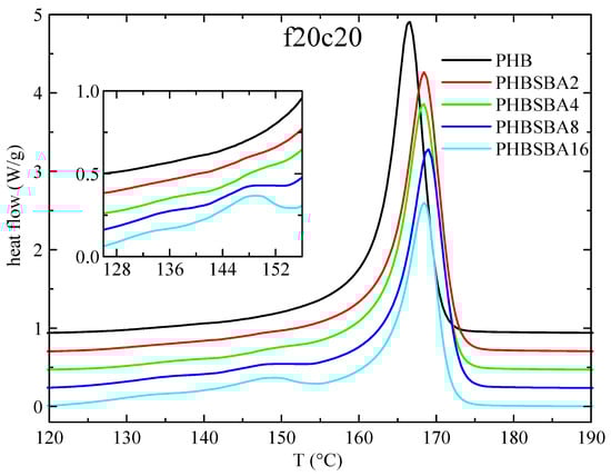 DSC heating curves (endo up) for PHB and its composites with SBA-15 in the first melting at 20 °C/min. The inset shows the amplification in the region of the melting of confined crystals of PHB.