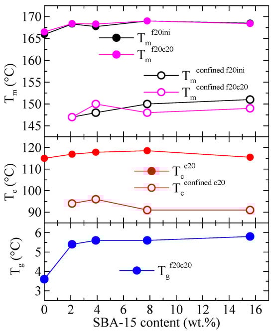 Variation with the SBA-15 content of the different thermal transitions observed in Figure 3, Figure 4 and Figure 5 is represented in Figure 6 for PHB and its composites. The differences among samples are almost not significant, although an increase in passing from PHB to the composites is usually observed, more evident at low SBA-15 amounts. More clear differences are deduced for the values of Tg (not shown in Figure 3, Figure 4 and Figure 5) where a significant increase from neat PHB to the composites is well evident.