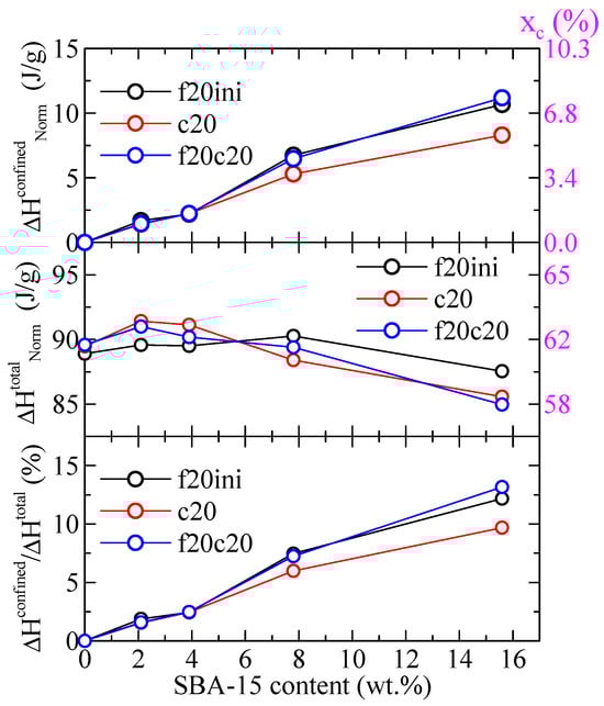 Regarding the values of the enthalpies involved, Figure 7 shows the variation with the SBA-15 content for different parameters in the PHB and its composites both the enthalpy for the confined component and the total enthalpy, for the different DSC ramps, and normalized to the actual PHB content in the specimen. It can be observed that the total enthalpy first increases with the SBA-15 content, and then reduces at the higher silica contents. The enthalpy for the confined components, however, increases markedly with the SBA-15 content (top frame in Figure 7), in such a way that the percentage of that enthalpy over the total one reaches values as considerable as 12–13%. Obviously, that increase shall be a consequence of the more total volume of silica channels available for the confinement of PHB chains as SBA-15 content increases.