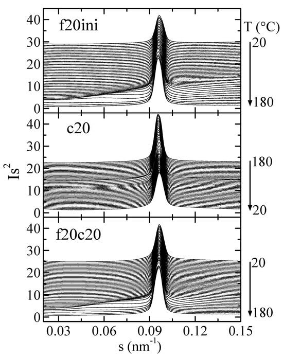 As mentioned above, SAXS experiments turned out a very useful and conclusive tool for analyzing the confinement in composites where mesoporous SBA-15 or MCM-41 particles were involved, independently of the nature of the polymeric matrix, since the intensity of the main (100) diffraction of the mesoporous silica shows a notable discontinuity. Therefore, synchrotron X-ray experiments were performed on selected samples. Firstly, Figure 8 shows the room-temperature WAXS diffractograms for neat PHB, displaying the profile of the initial compressed-molded specimen and that after cooling from the melt at 20 °C/min. In both cases, the usual α modification of PHB is observed [,,,], with the two main diffractions corresponding to planes (020) and (110). Moreover, the diffractions corresponding to the sample crystallized from the melt at 20 °C/min are slightly narrower than those of the initial compression-molded specimen, indicative of more perfect crystals in the former.