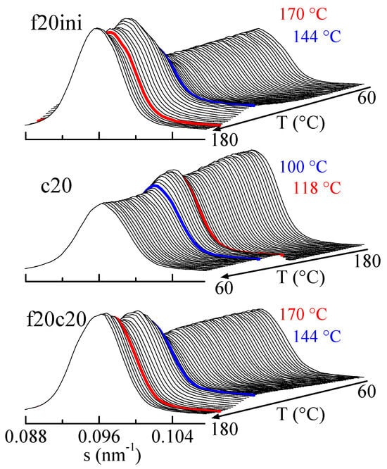 The amplification of the SBA-15 main reflection is rather informative, as observed in Figure 10. Focusing the attention on the first melting (top frame in Figure 10), it is seen that after an initial rather constant intensity of the SBA-15 diffraction, there is a pronounced increase centered at around 144 °C (blue diffractogram), and a much smaller change at around 170 °C (red diffractogram). Compared with the DSC results, these changes correspond to the melting of the confined crystals and to the main melting, respectively, but now the rather relevant issue is that confinement is much better observed than the total melting, contrary to the case in the DSC results.
