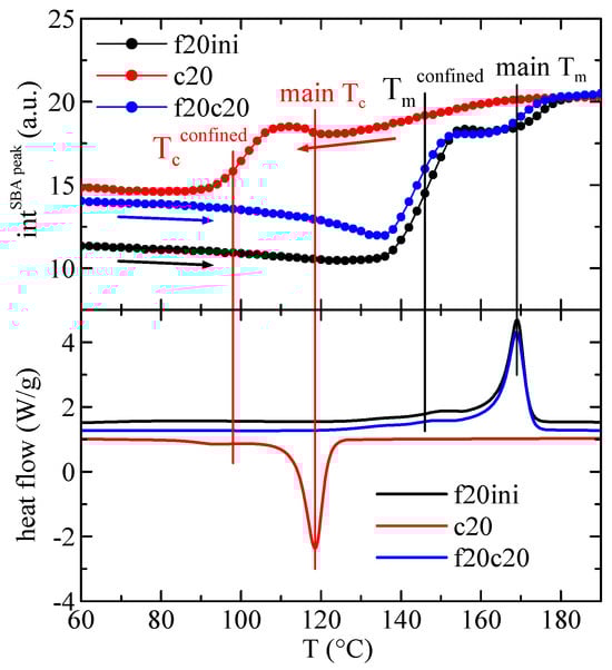 The quantification of the results in Figure 10 regarding the intensity of the main SBA-15 diffraction is represented in Figure 11, showing, in the upper frame, the variation with temperature of that intensity in composite PHBSBA8 during the first melting (f20ini), cooling (c20) and second melting (f20c20) processes, and compared with the corresponding DSC curves (lower plot). The concordance of the transition temperatures for the different events, indicated by the straight lines, is excellent among the two techniques. Moreover, it is well evident that confinement is much better observed through the variation of the intensity of the SBA-15 peak.