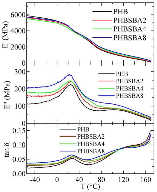 Variation with temperature of storage modulus, E′, loss modulus, E″, and tan δ curves (at 3 Hz) for PHB and its composites with SBA-15.