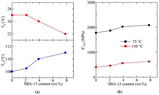 Figure 13b shows the variation in the silica content of the values of storage modulus at two different representative temperatures. Ideally, the best temperature to consider is 25 °C (ambient conditions) but, as observed in Figure 12, this temperature lies in the middle of the β relaxation (Tg), which is not convenient. Thus, the following representative temperatures were chosen: 75 °C: in between Tβ and Tα, and 150 °C: above Tα. It can be observed that at these two temperatures (both above Tg) the rigidity increases with the SBA-15 content. The reinforcement role of silica is mainly played as the polymeric matrix is softened, and values of storage moduli increase as the SBA-15 content does.