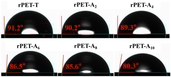 Compared with PET fiber, PA6 fiber has better hydrophilic properties. On this basis, the hydrophilic properties of the rPET-Ax fibers were investigated. As shown in Figure 2, the contact angle of rPET-Ax fibers decreases from 91.3° to 80.3° for the rPET-A10 with the increasing proportion of rPA6. Therefore, the hydrophilic performance of recycled fibers are improved by blending with rPA6.