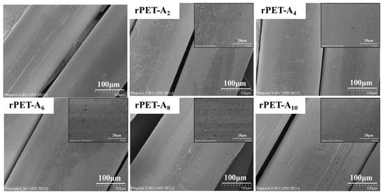 SEM (Regulus 8100, HITACHI, Tokyo, Japan) observation was performed to observe the phase morphology of the blends or fibers with a voltage of 5 kV. The samples for all the rPET−T/rPA6x blends were placed in liquid nitrogen for 30 min, and then the samples were cryogenic ally fractured vertically to the flow direction to observe the dispersion effect of rPA6 in the matrix. The surface of the rPET−Ax fibers was etched with HCOOH for 12 h to remove the rPA6 phase so as to observe the distribution of rPA6 phase on the fiber surface. Before SEM observation, all the rPET−Ax fibers treated surfaces were cleaned with distilled water and all the samples were sputter-coated with gold.