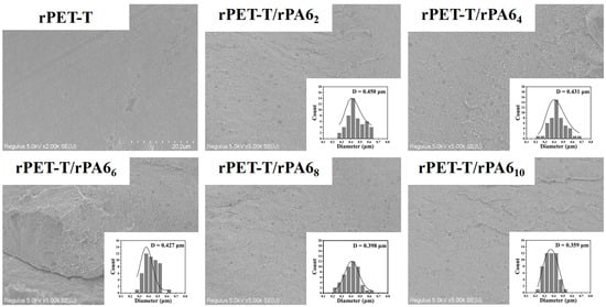 The mechanical properties of the recycled fibers are highly related to the compatibility of the two phases [,]. Therefore, we collected the rPET-T/rPA6x samples, which were obtained under the same melt processing conditions as rPET-Ax fibers (prepared without drawing), and then observed its micro-morphology by brittle fracture. The cross-section SEM images of the rPET-T/rPA6x are shown in Figure 4. A typical sea-island morphology structure was observed; there are no cracks or separations in the observation area, indicating that there is no obvious fracture or deformation phenomenon after the extrusion of rPET-T and rPA6. With the increase of rPA6 content, the average size of rPA6 dispersed phase gradually decreased. The average size of rPA6 gradually decreased from 0.450 μm for rPET-T/rPA62 to 0.359 μm for rPET-T/rPA610, which is much smaller than that of the incompatible two-phase system mentioned in other studies [,,]. It indicated that rPA6 was well dispersed in the rPET-T matrix.