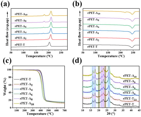 Thermal properties and crystal structures of the rPET-Ax fibers: DSC curves of rPET-Ax fibers: (a) cooling process, (b) melting process; (c) TGA curves of rPET-Ax fibers, and (d) XRD curves.