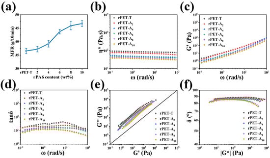 Rheological properties of the rPET-T and the rPET-Ax fibers with different rPA6 content at 265 °C: (a) MFR curves, (b) complex viscosity, (c) storage modulus, (d) loss tangent, (tan δ) on frequency, (e) Han plots, and (f) vGP plots. (Where ω stands for angular velocity, G′ stands for Loss modulus, and G* stands for complex modulus).