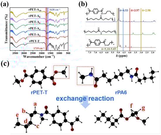 To investigate the chemical structural changes between rPET-T, rPA6, and rPET-Ax, the FT-IR spectra and 1H NMR spectra are shown in Figure 7. The stretching vibration peak of the C=O bond and the aromatic ring skeleton are located at 1719 cm−1 and 1605 cm−1, respectively, while the deformation vibration peak of the C-H bond on the benzene ring is at 873 cm−1 and the out-of-plane bending vibration peak of the carbonyl group is at 729 cm−1. These characteristic peaks prove the chemical structure of the rPET-T chain. The FT-IR spectrum of rPA6 is shown in Figure S2a. There are in-plane deformation vibrations and frequency doubling peaks of N-H at 1542 cm−1 and 3084 cm−1, respectively, and a C=O amide I band and a C-C (O) stretching vibration peak located at 1638 cm−1 and 1168 cm−1, respectively. The peak at 1638 cm−1 proves the existence of rPA6 in the rPET-Ax fibers. Infrared spectroscopy can qualitatively analyze the functional group structure of the molecular chain of the blend. The functional group changes caused by the self-compatible copolymer produced by the segment exchange reaction should be observed. Therefore, the 1H NMR spectra of the rPET-T, rPA6, and rPET-A10 in CF3COOD were measured, as shown in Figure 7b. The chemical shift peaks of the H in benzene ring of rPET-T chain located at 8.22 ppm and peak of H in methylene at 4.88 ppm. The chemical shift peak at 3.92 ppm is H on C closest to N-H and peak at 3.10 ppm is H on C closest to C=O. The remaining H corresponds to the chemical shift at 2.20, 2.11, and 1.87 ppm. It can be seen from Figure 7b that the chemical shifts at positions H of the rPET-T chain segments a and b correspond to 4.31 ppm and 2.10 ppm, as shown in the red area. After blending with rPA6, the ester amide exchange reaction occurred in part of the chain segment, as shown in Figure 7c. Because the amide group has a weaker electron absorption ability than the ester group, H at the position a and b will move towards the higher field after the ester bond of rPET-T received the rA6 chain segment; this is the chemical shift at 2.98 ppm and 1.54 ppm, as shown in the blue area.