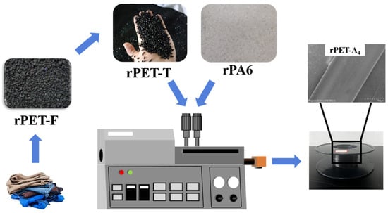 Waste fiber source polyester pellets (rPET−F) were provided by Fujian Baichuan Resource Recovery Technology Co., Ltd. (Quanzhou, China). These pellets are fabricated by small scraps of waste polyester fabric being passed through granulation. The intrinsic viscosity of the rPET−F was measured in the range of 0.52–0.57 dL/g, the melt mass-flow rate of rPET−F was measured 48.84 g/10 min, the size of rPET−F is in the range of 0.008–4 cm3, and the melting temperature is 245.45 °C. Ethylene glycol and antimony glycol were purchased from Sinopharm Chemical Reagent Co., Ltd. Recycled polyamide 6 pellets (rPA6) were obtained from waste PA 6 fabric by remelting and granulation, and were supplied by JING FENG Technology Co., Ltd. (Fuzhou, China).