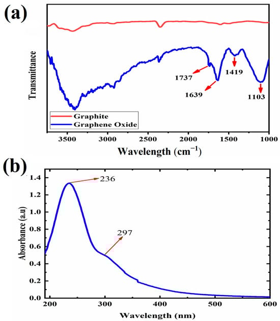 Figure 1 reports the FTIR and UV-Vis spectra of synthesized GO. The FTIR spectrum in Figure 1a demonstrates specific peaks observed at 1103, 1419, 1639, and 1737 cm−1, corresponding to the chemical bonds of C-O-C, C-OH, C = C, and C = O in GO, respectively [29,30,31,32,33]. FTIR of graphite in Figure 1b has been compared to GO to validate the functional groups of GO. Furthermore, the UV-Vis spectrum of GO reported in Figure 1b shows two typical peaks at 236 nm and 297 nm, representing the π-π* transition of C = C bonds and the n-π* transition of C = O bonds, respectively [25,34].