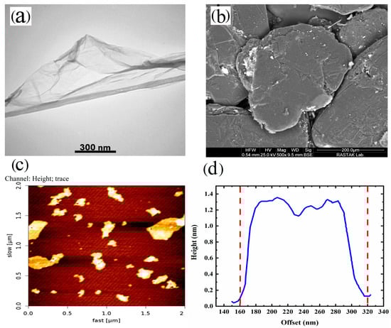 Figure 2. (a) TEM micrograph of GO, (b) FE-SEM image of graphite, (c) AFM image of GO, and (d) height profile of GO nanoplatelets.