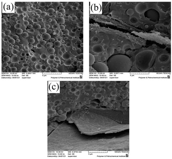 A TEM analysis was conducted on the (PLA/EVOH)/0.25GO sample to elucidate the specific localization of the GO particles. Figure 5 provides a visual representation of the localization of GO within the EVOH phase when 0.25 wt.% GO was loaded. In Figure 5b,c, dark regions, especially in the top, right, and bottom left of Figure 5c, can be observed. These dark regions may be related to the PLA. The increase in droplet size resulting from the incorporation of a higher amount of GO (0.5 wt.%) into PLA/EVOH can be attributed to the enhanced droplet coalescence, subsequently leading to larger droplets [15,42].