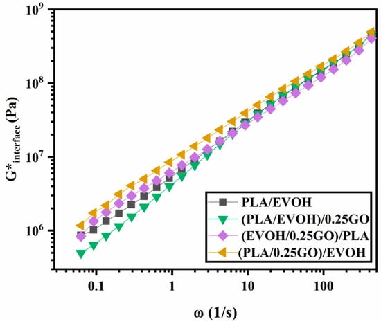 Figure 13. G*interface of Lee–Park model for PLA/EVOH, (PLA/EVOH)/0.25GO, (EVOH/0.25GO)/PLA, and (PLA/0.25GO)/EVOH samples.