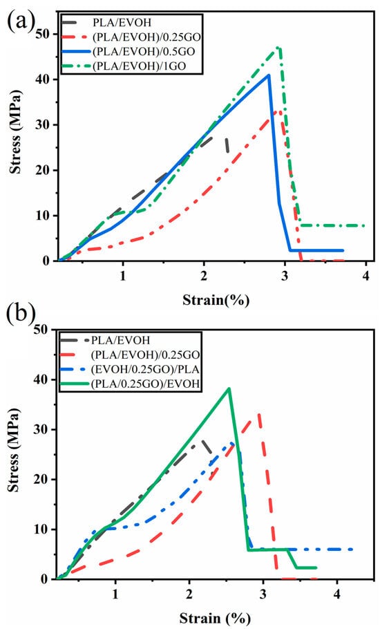 Figure 16. Stress-strain graphs illustrating (a) the impact of graphene oxide (GO) content on the mechanical properties of PLA/EVOH composites and (b) the influence of mixing protocol on the mechanical properties of PLA/EVOH/GO composites.