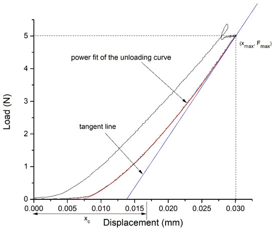 where F represents the current load, x is the current displacement, and xf, m, and C are the parameters of the fit. The stiffness was calculated as the slope of the tangent line on the unloading curve at the point of the maximum displacement and load (xmax, Fmax), i.e.,