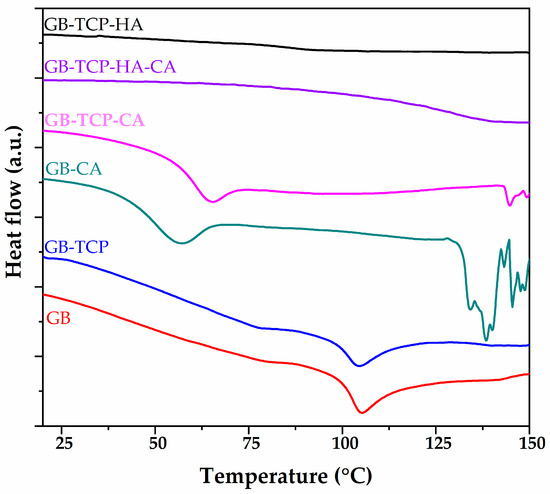 The results of DSC analysis—the Tg and Tm of samples—are presented in Figure 3. It can be seen that samples have shown a semi-crystalline structure due to the presence of both Tg and Tm. The reduction in Tg value for sample GB-TCP-HA compared to pure GB could be the consequence of the formation of large agglomerates that act as plasticizers. However, as the temperature increases, thermally stable agglomerates present obstacles in a phase transition, increasing Tm for hybrid composite GB-TCP-HA in comparison with pure GB. After adding citric acid and thermal treatment, it looks like the crystallinity of the polymer is increased. However, together with the decrease in the melt temperature, it could be concluded that cross-linking occurred. The crystalline structure of gelatin mostly results from its α-helix and triple helical structure. During cross-linking, the carboxylate groups in CA react with the gelatin’s hydroxyl and amine groups, leading to lower crystallinity. It can also be noticed that the isomerization of the peptide bonds in gelatin from the trans to the cis configuration occurred in samples GB-CA and GB-CA-TCP from 130 °C and 143 °C, respectively [50,51,52,53]. This could be a consequence of lower helical conformation due to the cross-linking process [54].