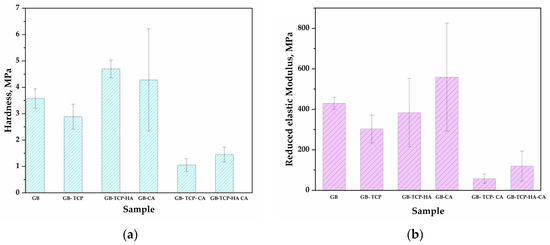 Results of microindentation test (mean values with standard deviations): (a) hardness; (b) reduced modulus of elasticity.