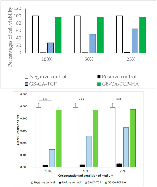 Cytotoxic effect of media conditioned with GB-CA-TCP and GB-CA-TCP-HA on L929 cells based on metabolic activity of cells in an indirect assay (MTT) presented as optical density (O.D.) values obtained on 570 nm. Data are presented as mean ± SD for hexaplicates of treated cells in the culture.(*** represent statistical significance, p < 0.001).