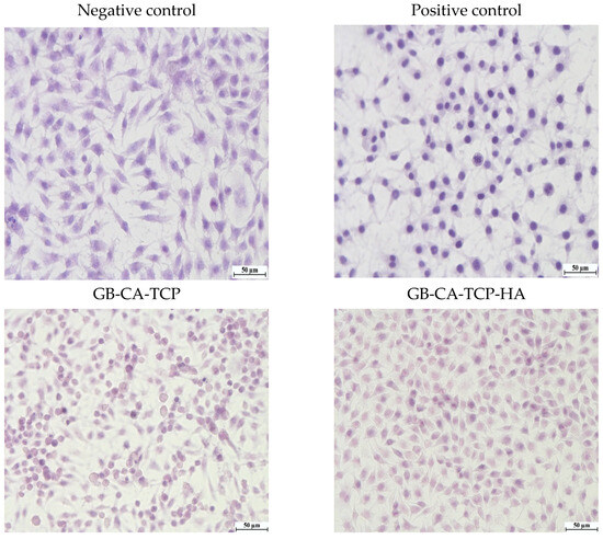 The results of the MTT assay in Figure 7 show that the method used to cross-link gelatin with CA had minor cytotoxicity in composite with TCP, while hybrid composite with TCP and HA has shown no cytotoxicity [55]. That could be explained by the different sizes and spatial distributions of particles in GB-CA-TCP and GB-TCP-HA-CA, which lead to differences in the cross-linking process and content of free CA in composites [56]. Hematoxylin staining of cells treated with conditioned media mirrored the results obtained in the indirect assay (Figure 8). Cells treated with GB-CA-TCP-conditioned media showed the phenotype similar to the one observed in the positive control—most of the cells were in the terminal phase of apoptosis, some of them with condensated chromatin and changed phenotype. On the other hand, the phenotype of cells treated with GB-CA-TCP-HA-conditioned media matched with cells in the negative control—alive and healthy with a few cells in senescence. Hence, these results confirmed the cytotoxicity of cross-linked gelatin with CA in composite with TCP and the absence of a cytotoxic effect of the hybrid composite with TCP and HA.