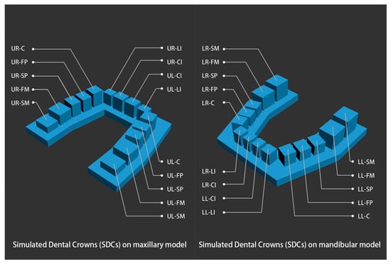 The simulated dental crowns (SDCs) of the structurized dental models. UL, upper left. UR, upper right. LL, lower left. LR, lower right. CI, central incisor. LI, lateral incisor. C, canine. FP, first premolar. SP, second premolar. FM, first molar. SM, second molar.